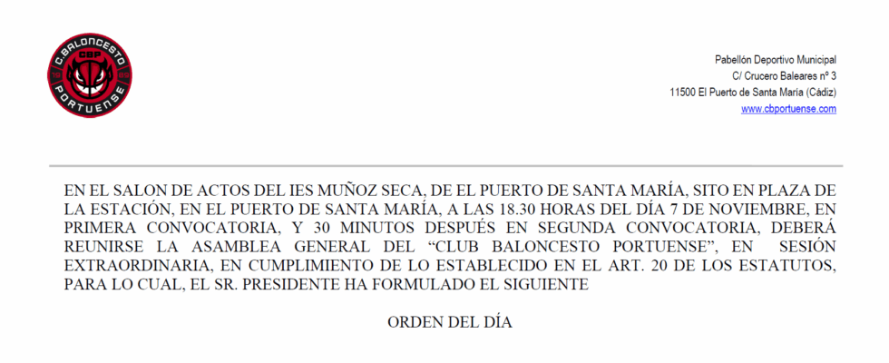La Asamblea se celebrará el próximo día 7 de noviembre de 2025, en el salón de actos del IES «Pedro Muñoz Seca», sito en Plaza la Estación, en El Puerto de Santa María, a las 18’30 horas en primera convocatoria, y a las 19’00 horas en segunda.